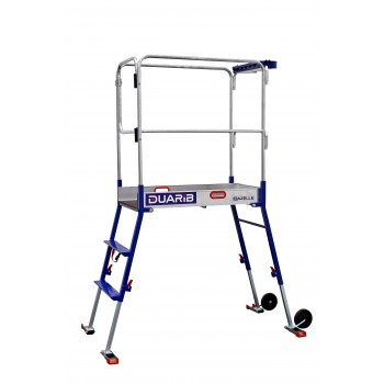 Aluminium / Acier galvanisé. Conforme à la Réglementation Française/Décret 2004-924 / Norme PIRL. Label NF. 4 hauteurs de travail de 2,70m à 3,00m. Stabilisateurs rabattables au pied, plus pratiques et plus rapides à mettre en place. Plancher spacieux, 0,96 x 0,48 m, avec 2 poignées de manutention intégrées aux plinthes. Accès larges marches avec antidérapant puissant. Tablette multifonctions. Capacité 30 kg. La tablette peut recevoir un fût de 15 litres. Garde-corps avec portillon sécurisé pour une protection permanente et incontournable. Réglage en hauteur des 4 pieds plus facile et intuitif. Charge utile 150 kg. Roues de déplacement de diam. 150 mm non marquantes. Dimensions hors tout, stabilisateurs repliés : L. 1.60 x l. 0.60 m.