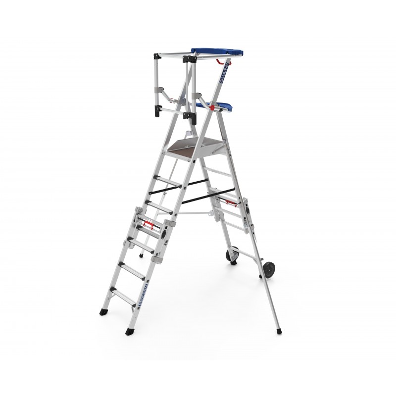 Aluminium. Conforme à la Réglementation Française/Décret 2004-924. Normes PIRL (XT5) / PIR (XT7-XT9) et EN 131-7. Label NF. Télescopiques 3 ou 4 hauteurs. Plancher antidérapant 0,50 x 0,40 m. Charge utile 150 kg. Protection arrière par garde-corps rigide et articulé. Mise en place du garde-corps en un seul geste. Stabilisateurs très faciles à déployer et à réglage millimétrique. Dimensions pliées optimisées. Facile à déplacer sur le chantier. Réglage de la hauteur par plans coulissants actionnés par commande manuelle avec verrouillage automatique. Installation en dénivelés intégrée. Marches antidérapantes de 60 mm. Roues diam 200 mm non marquantes. 2 tablettes de série : tablette supérieure multifonctions et incurvée pour travailler au plus près du mur, tablette inférieure adaptée pour fût de 15 L.